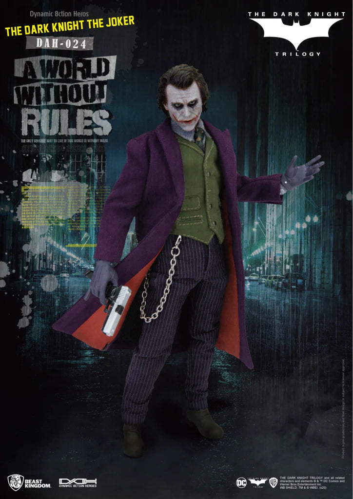 Produzida na escala 1/9 dentro da linha DAH (Dynamic 8ction Heroes), a figura apresenta visual altamente fiel à versão cinematográfica, com terno roxo texturizado, colete verde, gravata estampada e a maquiagem borrada característica. A escultura facial captura a expressão intensa e perturbadora do personagem, enquanto o cabelo esverdeado despenteado reforça o visual caótico.